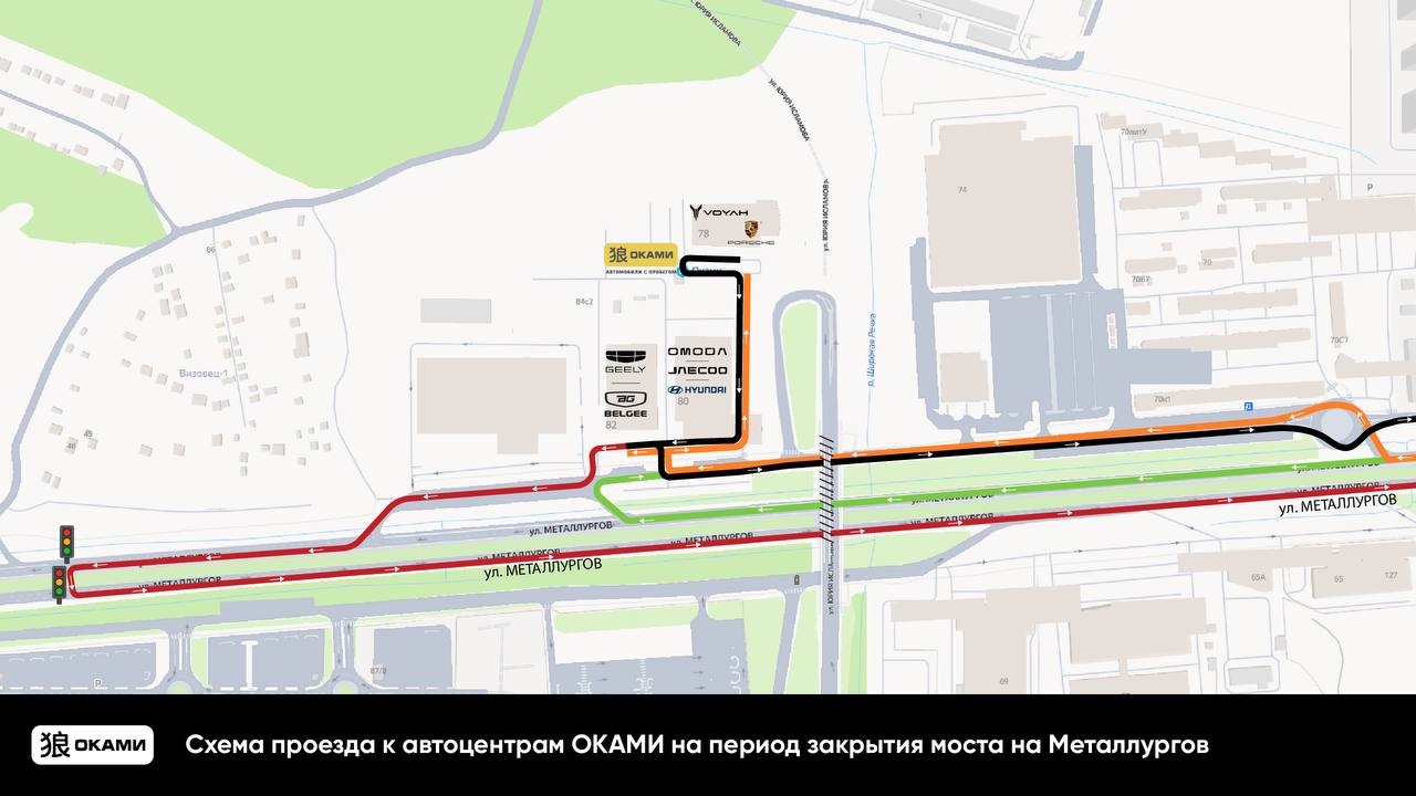До "Оками. Автомобили с пробегом" на Металлургов, 78/1 вы без проблем можете проехать по дублёру ул. Металлургов.